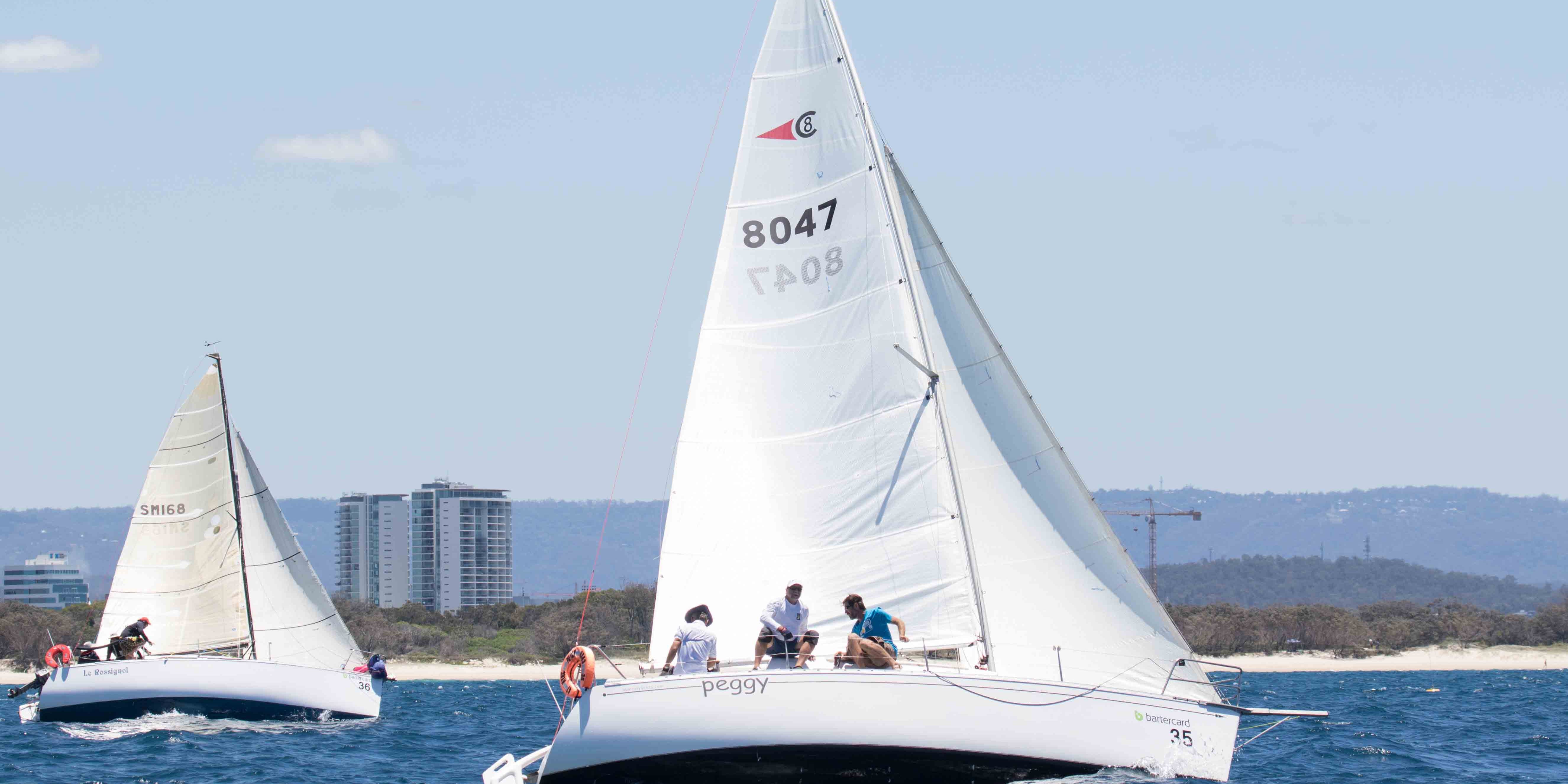 - Benjamin Meakin and crew sailing ‘Peggy’ on day two in the 2016 Bartercard Sail Paradise regatta.